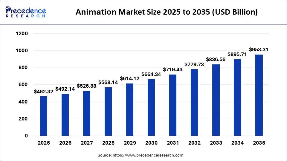 Ottawa, Dec. 23, 2025 (GLOBE NEWSWIRE) -- According to Precedence Research, the global animation market size is valued at USD 462.32 billion in 2025 and is expected to grow from USD 492.14 billion in 2026 to USD 953.31 billion by 2035. The sector is growing at a solid CAGR of 7.52% from 2025 to 2034. The growth in streaming platforms, technological advancements in animation, and the growing demand for animated content drive the overall growth of the market.