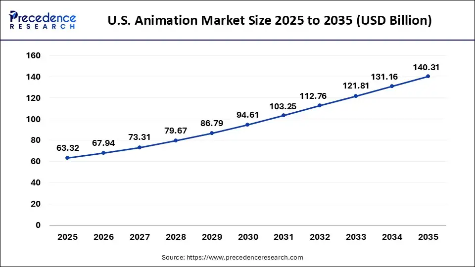 According to Precedence Research, the U.S. animation market size is estimated at USD 63.32 billion in 2025 and is predicted to increase from USD 67.94 billion in 2026 to USD 140.31 billion by 2035. The market is expected to expand at a notable CAGR of 8.28% from 2026 to 2035.