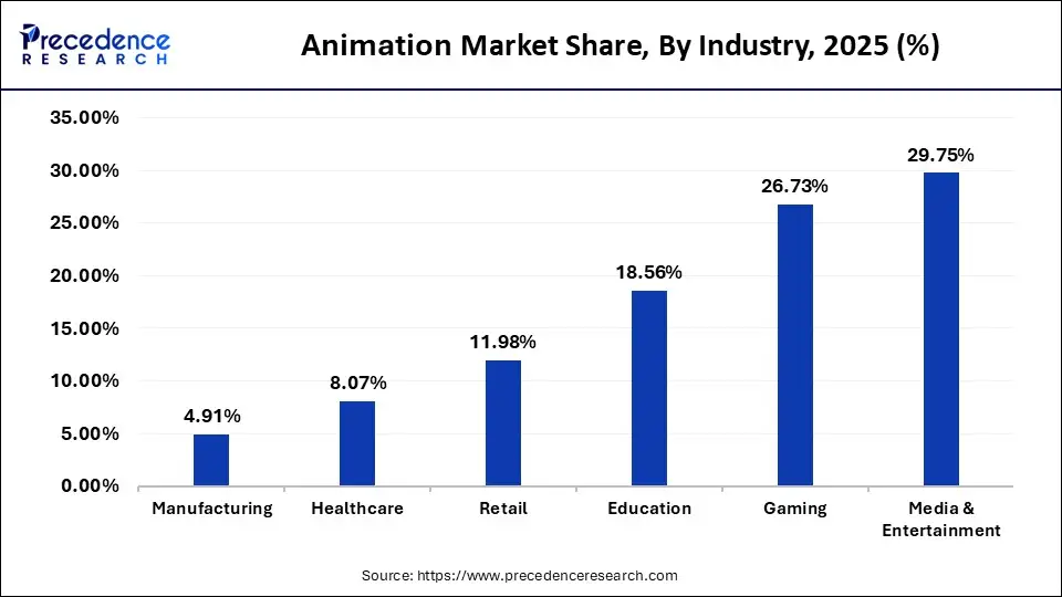 - Media and entertainment emerged as the largest industry segment, contributing over 29.75% of total animation market revenue in 2025.